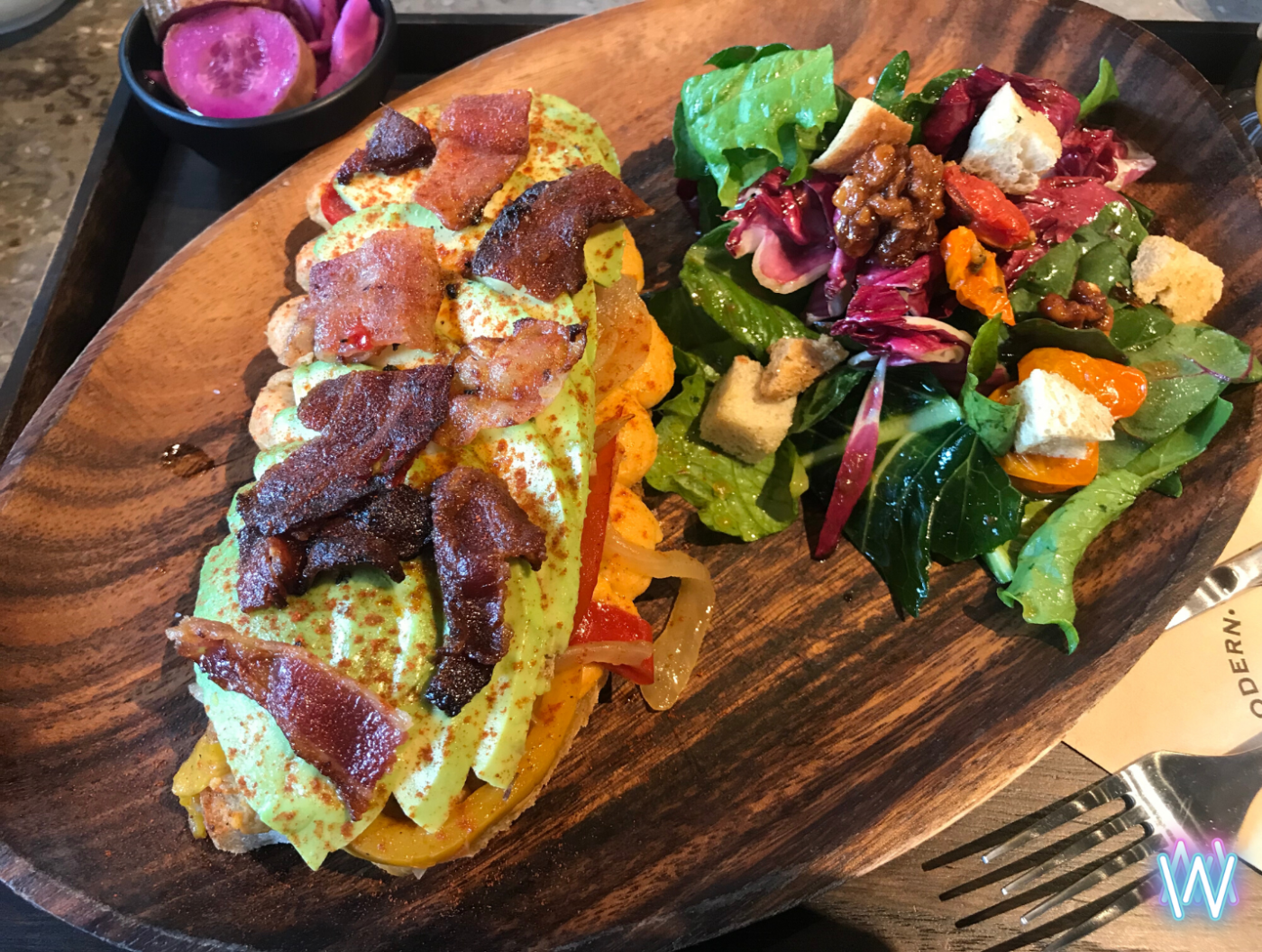 I ordered the bacon avocado toast with hummus because I cannot resist hummus. They put a thick layer of hummus on the toast and topped it with sauteed peppers and onions that added a sweet layer between the saltiness of the hummus and the freshness of the avocado. All of this topped with maple bacon and I felt as though I was in heaven. It is one piece of bread but there is so much on top it is incredibly filling. I also had a small salad on the side that was literally one of the best salads I have ever eaten. The lettuce was fresh and green and I could taste the fresh basil they put on the tomatoes. The candied walnuts were actually good, and I hate walnuts, and they added a nice contrast with the salad.