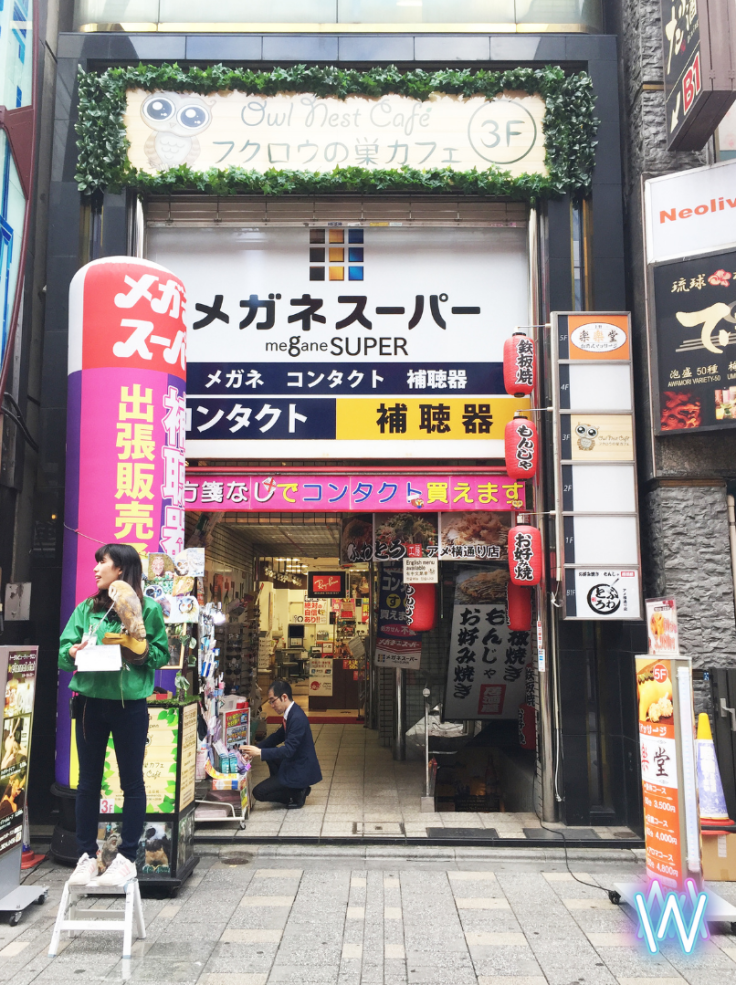 Like many businesses in Japan, the cafe shared the building with several other businesses, so it was a little hard to see at first. Luckily, one of the employees was standing on the ground floor with an owl advertising the cafe, so we were able to find our way.